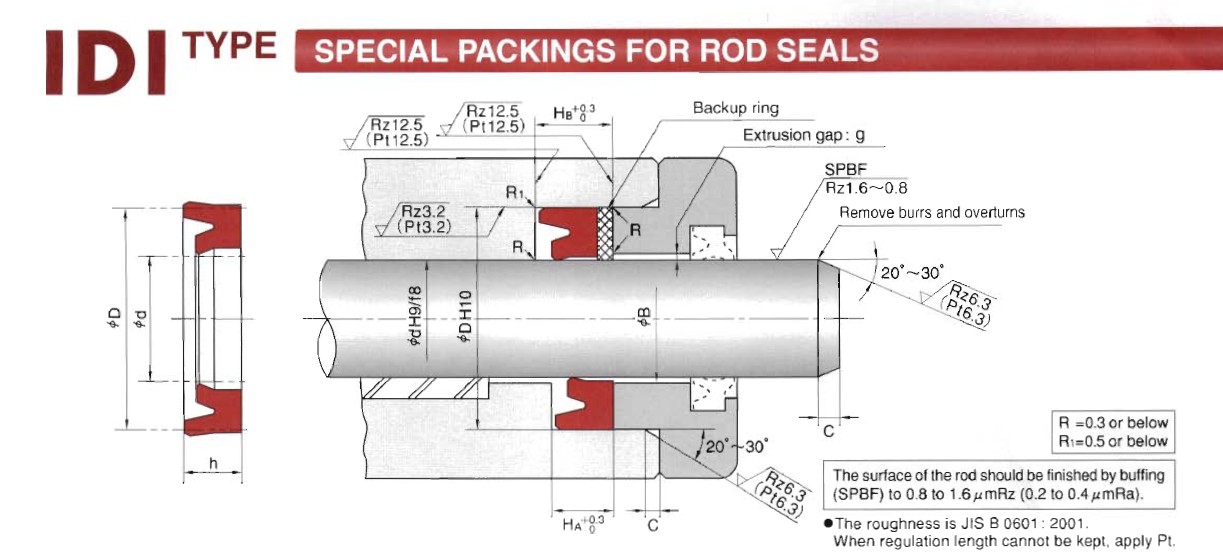 IDI型軸用密封主要材料是邵爾94度聚氨酯,壓力可達(dá)到70MPA,溫度:-35度---+100度,有極好的耐磨性和密封能力。他有較大的截面,可用于大范圍的壓力。