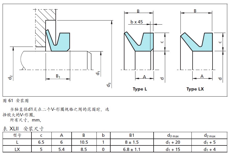 VL形水封的尺寸經(jīng)??梢詮囊唤M直徑范圍內(nèi)選取,如軸的公稱(chēng)直徑是處于兩組推薦值的邊界范圍外,則應(yīng)選用下一組較大的VL形水封。