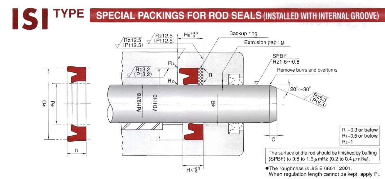 ISI型軸用密封主要材料是邵爾94度聚氨酯,壓力可達到42MPA,溫度:-35度---+100度,有極好的耐磨性和密封能力。他有較小的截面,可裝入整體溝槽中。